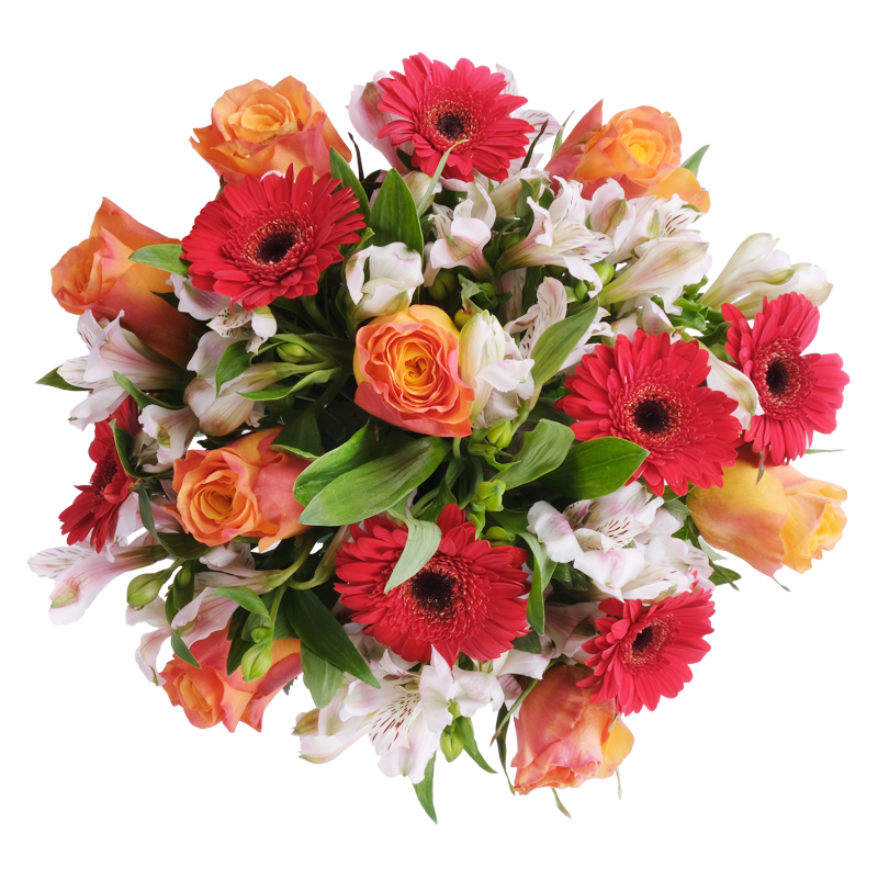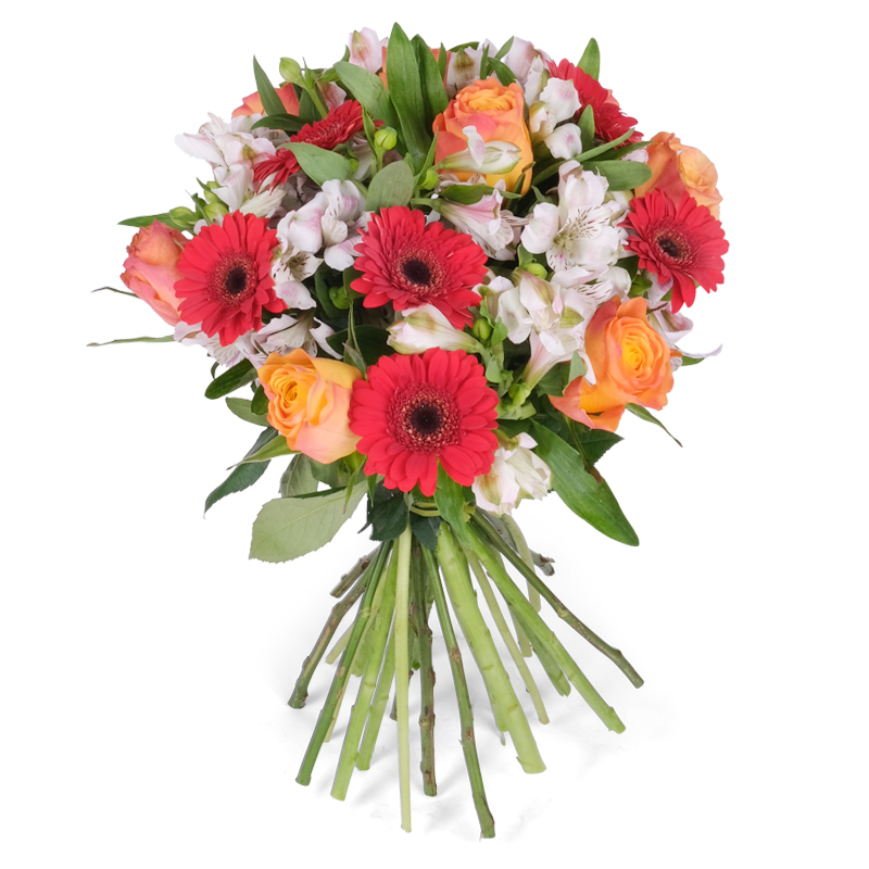 Eleganckie róże, wyraziste gerbery i wdzięczne alstromerie tworzą harmonijną całość. Kompozycja łącząca energię z delikatnością. Świeże liście podkreślają naturalny charakter. To bukiet pełen kobiecej mocy!