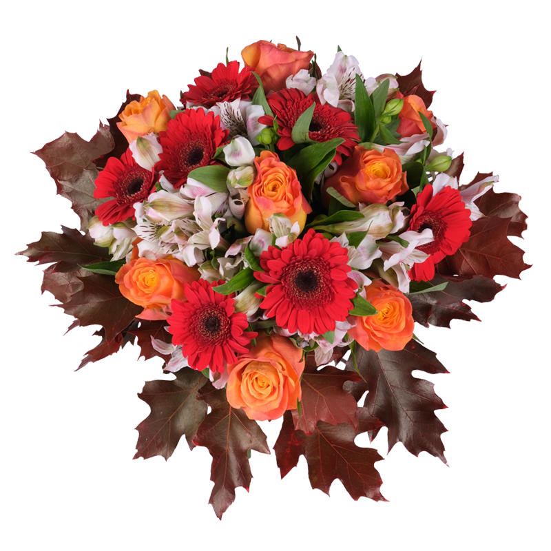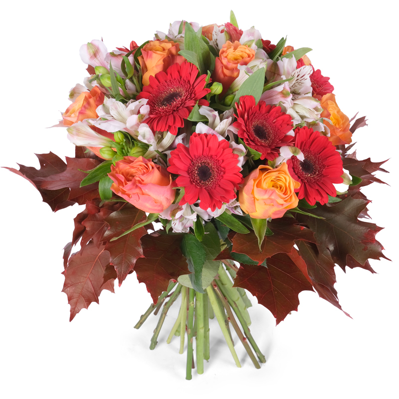 Subtelna kompozycja, w której róże, gerbery i alstromerie tworzą wyjątkowy duet wraz z jesiennymi liśćmi. Całość wygląda świeżo i elegancko. To bukiet, który wnosi harmonię i spokój. Doskonały na prezent lub dekorację domu. Z pewnością wywoła zachwyt u każdego, kto otrzyma taki podarunek!