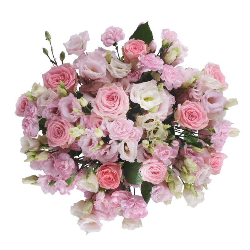 Idealna harmonia kwiatów – róże, eustomy i goździki w różowej kolorystyce tworzą bukiet „Połączenie idealne”. Nie zapomnij o bileciku – czasem kilka słów mówi więcej niż gest.